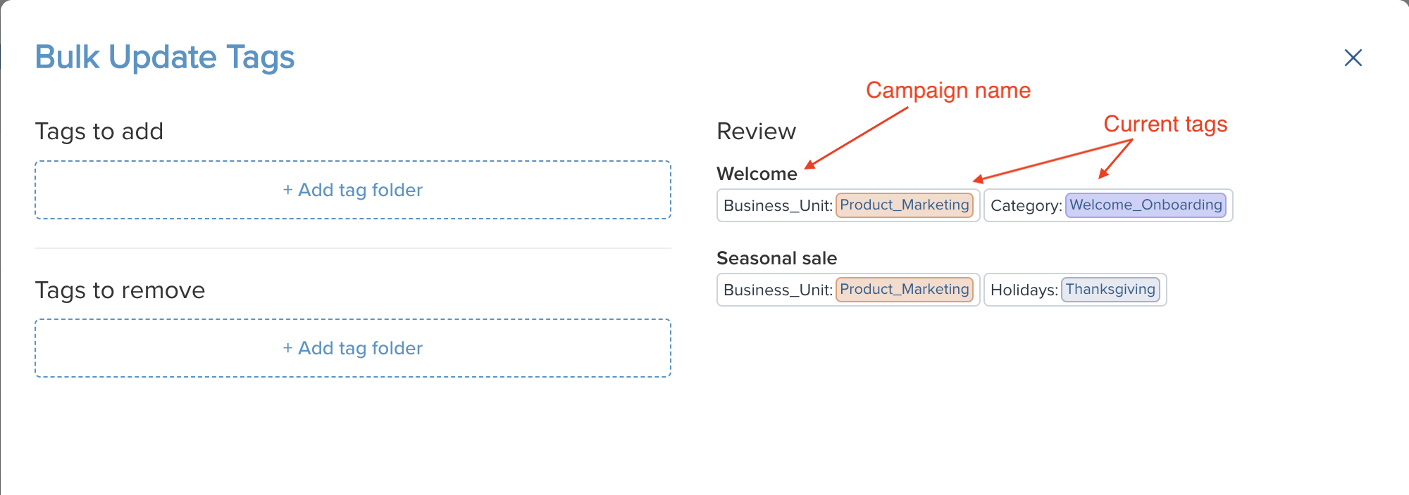 Once your account has some tag folders and tags, you can start tagging resources. Taggable resources include campaigns, templates, recommendations, segments and syndications.