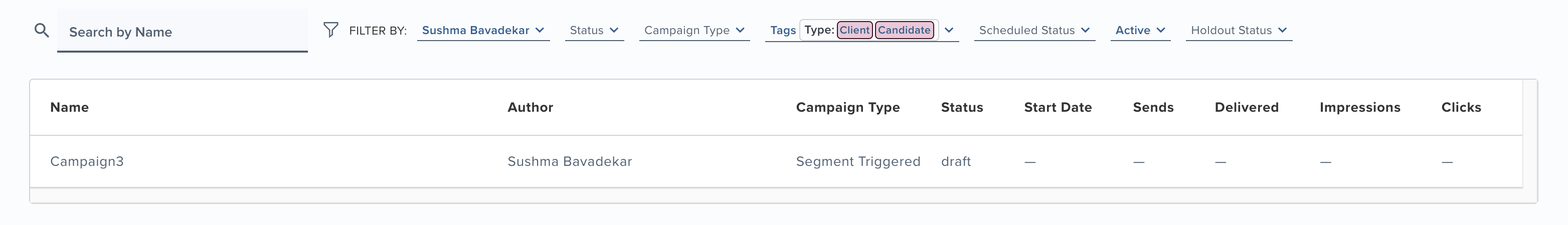 - On the Campaigns index page, filter campaigns by: Type = Candidate AND Type = Client
